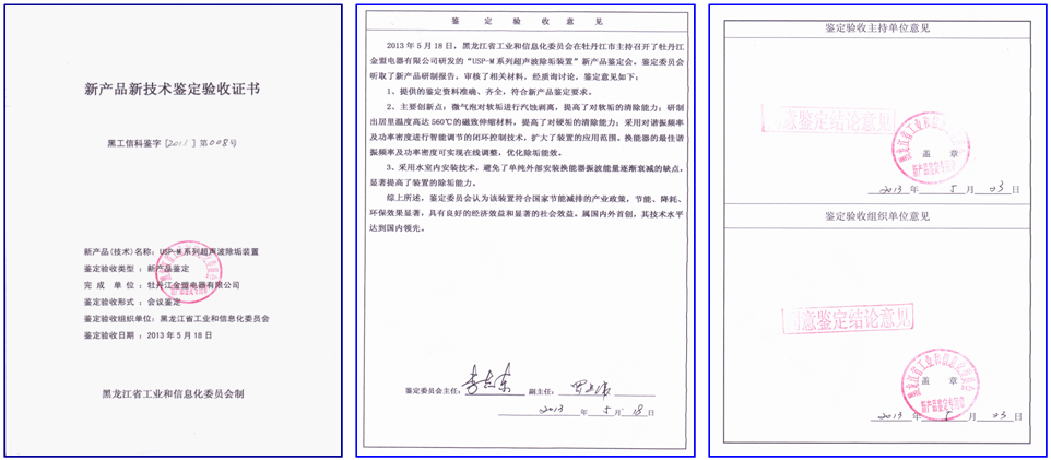 2013年5月,由黑龍江省工信委科技處組織,對USP-M系列超聲波除垢裝置進行了新產(chǎn)品鑒定,鑒定結(jié)論:“屬國內(nèi)外首創(chuàng),其技術(shù)水平達到國內(nèi)領(lǐng)先”。