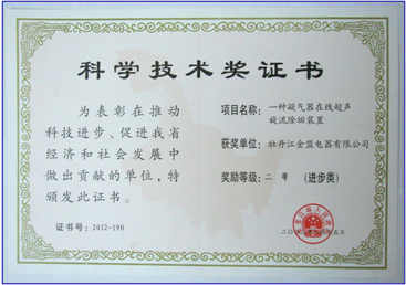2010年,“一種凝汽器在線超聲波旋流除垢裝置”在電力系統(tǒng)200MW機組凝汽器安裝使用,填補了國內(nèi)空白,該項目于2012年獲得黑龍江省人民政府 “科學(xué)技術(shù)二等獎”,2013年,獲得國內(nèi)“首臺套獎勵”。